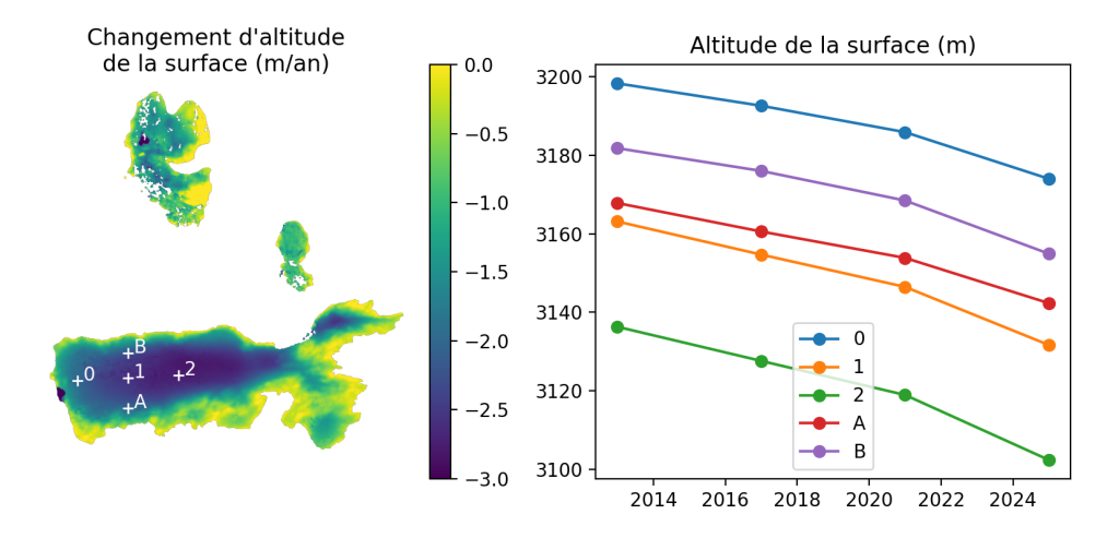 Il semble que l’abaissement de la surface s’accélère entre 2021 et 2025 en particulier au centre du glacier (point 2). Pendant cette période, le glacier a subi les été chauds et secs de 2022 et 2023, puis les vagues de chaleur de l’été 2025.