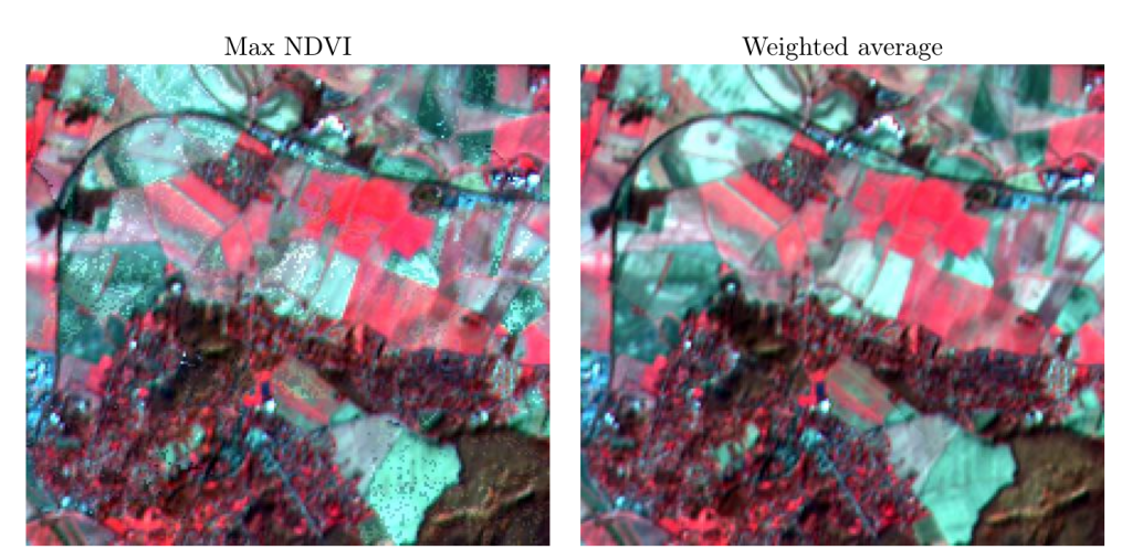 l’avantage des produits fournis de niveau 2A fournis par MAJA, c’est la qualité de leur masque de nuages et d’ombres. Même s’il n’est pas parfait, la plupart des nuages et des ombres sont détectés, et seuls les plus fins peuvent échapper à la détection. En conséquence, nous n’avons plus besoin d’utiliser un critère qui a tendance à supprimer les nuages, il suffit de supprimer les données classées comme ombres ou nuages. Nous avons donc développé la chaîne WASP (Weighted Average Synthesis Processor). La méthode a été définie il y a bien longtemps (en 2008) au CESBIO pour le satellite Venµs. En 2015, nous avons inclus cette méthode dans le projet Sen2Agri, financé par l’ESA, pour l’appliquer à la mission Sentinel-2. Dans ce cadre, nos collègues de CS-Roumanie ont redéveloppé le logiciel pour le rendre plus opérationnel, et le distribuer comme logiciel libre. Finalement, Peter Kettig, au CNES, l’a adapté aux formats du centre de traitement MUSCATE en introduisant quelques améliorations et en corrigeant quelques bugs.