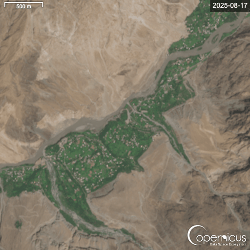 Using Sentinel-2 imagery I could also find that the source of the flood is probably a glacial lake located 12 km upstream (WGS 84 coordinates 36.146°, 73.621°).