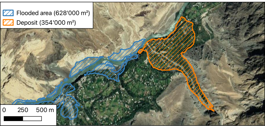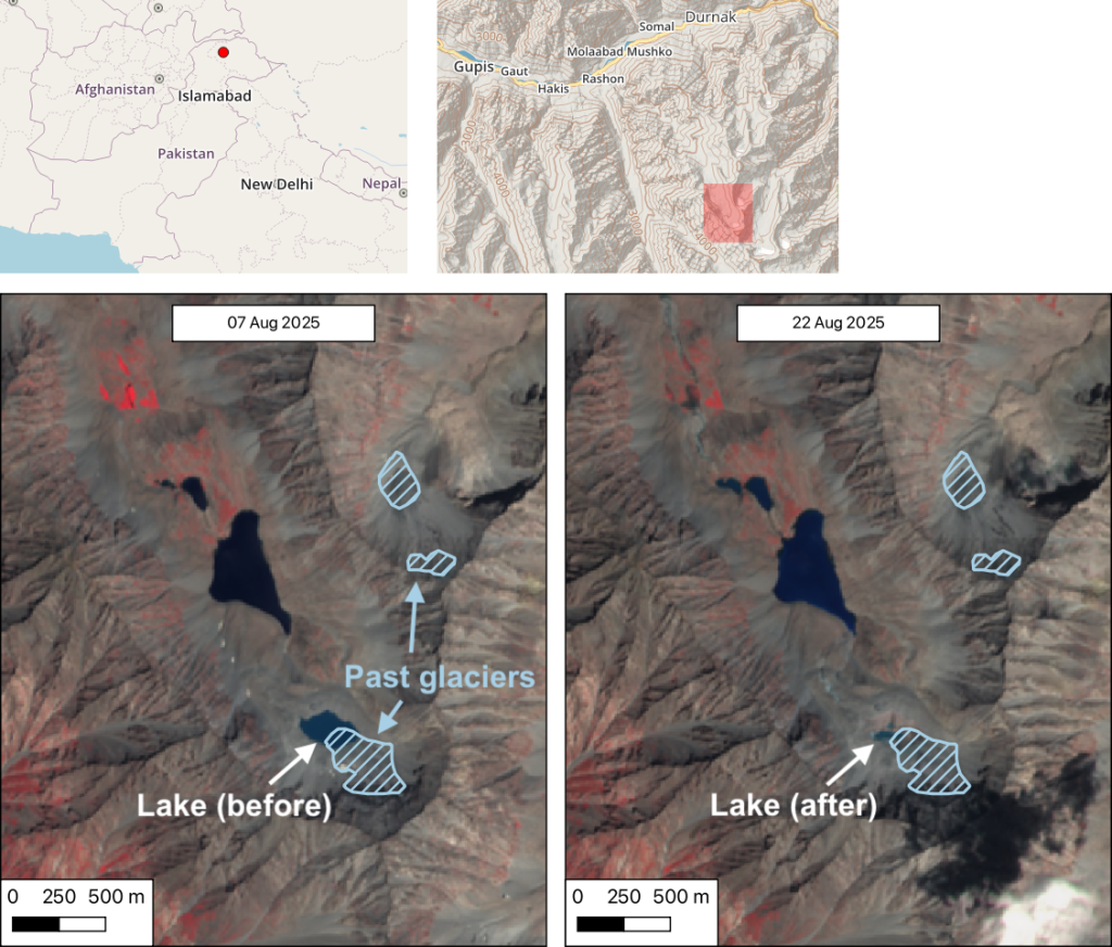 This lake was small before it collapsed (42’000 m²) and was not really a glacial lake since the glaciers are not visible anymore in 2025. Hence the primary cause of this cascading disaster may not be a « GLOF » strictly speaking?