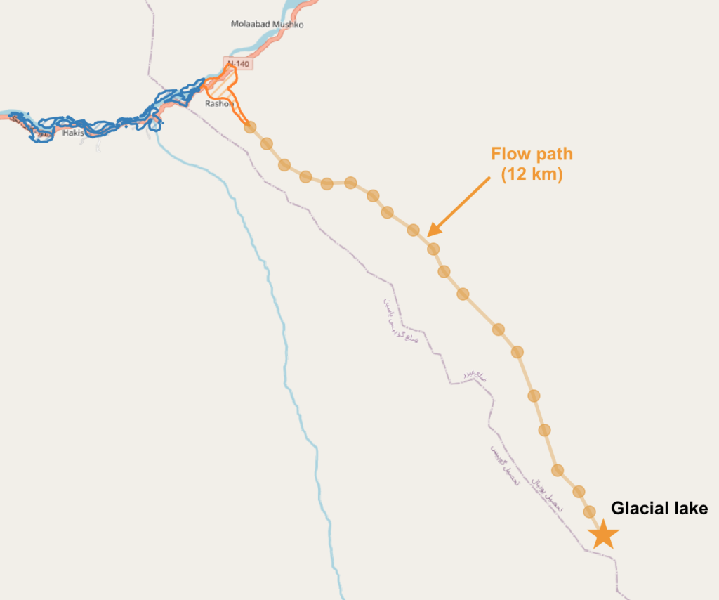 Possible source of the flood. Glaciers polygons from the Randolph Glacier Inventory Version 7.0 (RGI 7.0 Consortium, 2023 doi:10.5067/f6jmovy5navz). The metadata indicate that the source date of the central glacier is 2001-07-11. Now the glacier is not visible anymore.
