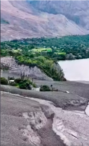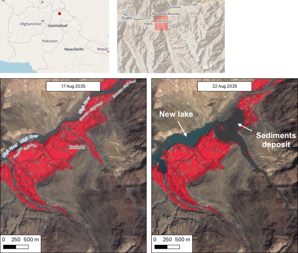 Satellite images show that the flood triggered a debris flow, which reached the Gupis valley where it hit the Roshan (Rashon) village and blocked the Gilgit river. The debris cone created a dammed-lake near in the village of Roshan (similarly to the Blatten glacier collapse in Switzerland). I estimate that the flooded area due to the sediments dam was 0.63 km² on 22 Aug 2025. The sediment deposit that fans outwards the Roshan valley and blocks the river flow was about 0.35 km².