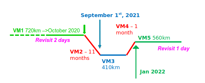 Of course, we did not manage to make both experiments at the same time, as the frequent revisit required to maintain the satellite at a high altitude, 720 km, and to be exactly at the same place every second day, while the electric propulsion was there to move the satellite. It was therefore decided to split the mission in different phases, that we called VENµS Mission x (VMx) :